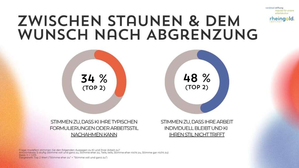 Die repräsentative quantitative Befragung (n=1.015) und 32 zweistündige rheingold-Tiefeninterviews zeigen: Wir stehen erst am Anfang einer weitreichenden seelischen Disruption. KI verändert nicht nur Arbeitsprozesse, sondern stellt Identität und Selbstwert in Frage. Arbeit ist in unserer Kultur mehr als Erwerbstätigkeit – sie ist Ausdruck der eigenen Handschrift, Kreativität und Kompetenz. Genau hier berührt KI einen Nerv: 33 Prozent stimmen (eher) zu, dass KI ihren Arbeitsstil nachahmen kann. 48 Prozent halten ihre Arbeit für individuell. Insgesamt spüren die Menschen eine wachsende Konkurrenz durch eine Technik, die ihre Fähigkeiten nachahmt oder gar kopiert.