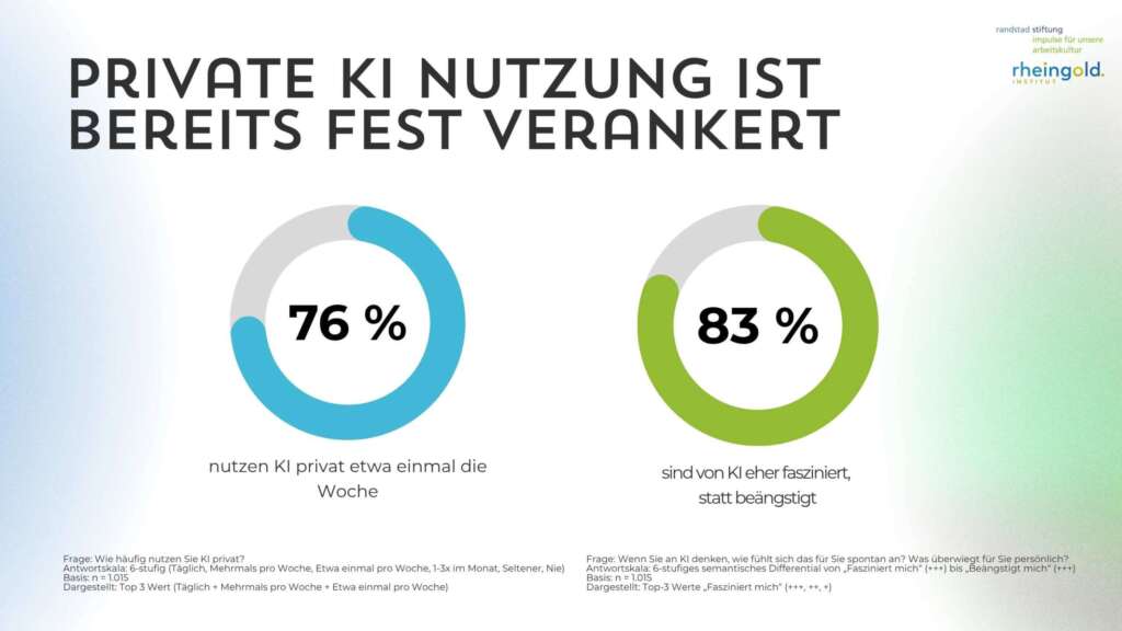 Die Grundgesamtheit wurde über eine repräsentative Bruttostichprobe abgebildet (nach Alter, Geschlecht und Region). Innerhalb dieser Stichprobe haben wir dann gezielt jene Personen betrachtet, die angeben, gelegentlich KI im Arbeitsalltag zu nutzen. Die Ergebnisse sind also repräsentativ für die Gruppe der KI-Nutzenden im Arbeitsalltag in Deutschland im Alter von 30–60 Jahren mit einer Erwerbstätigkeit ab 20 Stunden – nicht für die Gesamtbevölkerung.